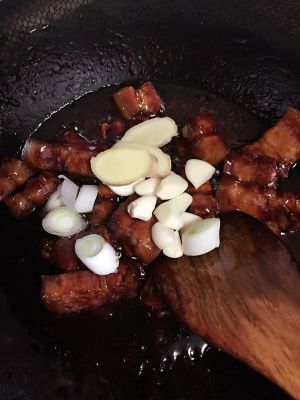 放入葱姜蒜和大料炒香,放入调味料翻炒片刻