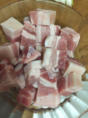 將五花肉洗乾淨後切成這樣的塊狀,待用。