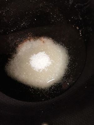 炒糖色,非常关键的步骤。锅中倒入适量油,油热后倒入适量白砂糖,小火慢炒。