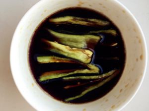 将捞汁、糖、醋、酱油、蚝油、香油调和成浇汁,辣椒放到浇汁里浸泡10分钟,然后捞出。(因为不喜欢吃葱和香菜,所以没有加到浇汁里,如果没有忌口,可以加入这两样,味道更为丰富噢,辣椒也可用辣椒油代替)。