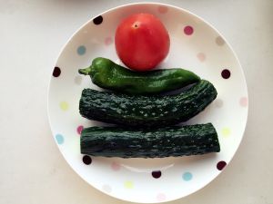 黄瓜和西红柿切成小丁,辣椒(俗称辣妹子,超级辣的一种)去掉蒂和芯,切成四条,备用。