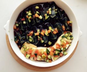将切好的皮蛋和豆腐摆盘,撒上黄瓜和西红柿丁,最后一步,浇汁。
