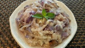 将冷却后的茄子用手撕成条儿,根据自己口味加入适量的盐,糖,鸡精,少许的白醋和花椒油进行调味,搅拌均匀后放置5分钟。