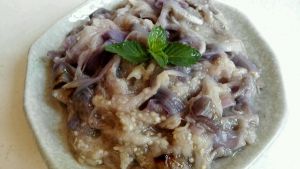 将茄子晾凉,切成丝,或者手撕。(把茄子拍扁一下,味道更好一点)