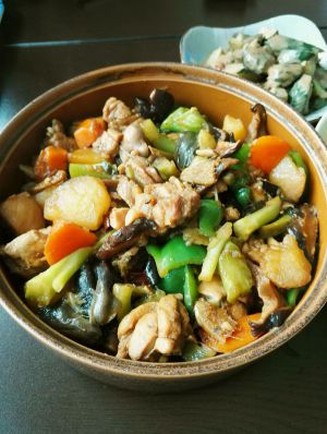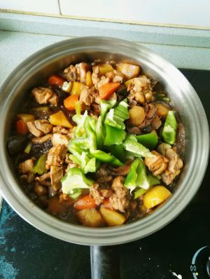 鸡块儿炖15分钟后入土豆 胡萝卜 茄子 西兰花根点入黄酒盖盖儿,再5分钟入青椒盖盖儿,3分钟后开盖儿看汁多少安排收汁儿,关火起锅。