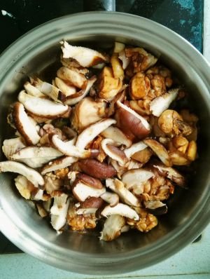 1.入鸡块儿翻炒几下 加香菇 2.入生抽 老抽 料酒 翻匀盖锅盖儿
