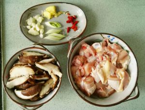 1.香菇 鸡腿 葱姜蒜 小米椒 均改刀
