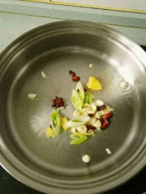 1.入一点底油 大料 葱姜蒜小米椒 爆香