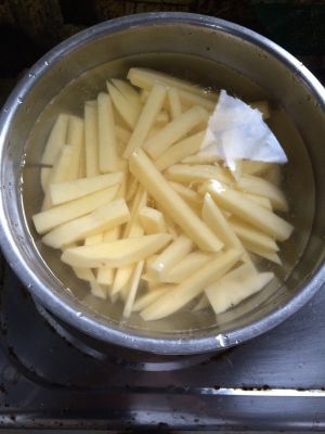 土豆切条淘洗一下,泡在水里,避免土豆氧化发黑。