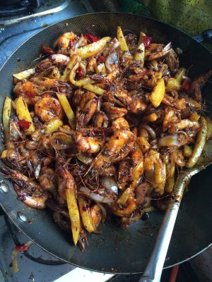 虾炸好后,多的油倒出,留少许,先放花椒,然后放入姜、蒜,最后放入洋葱、辣椒,炒出香味后放入虾、碗汁。