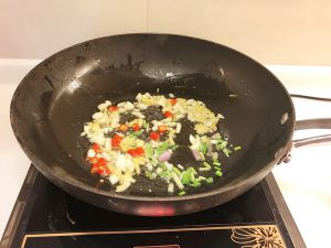 锅中留底油,放入大蒜片、干辣椒段、姜片炒香。