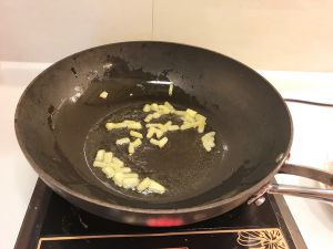 锅内倒油,姜切丝蒜切未爆炒出香味
