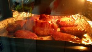 时间到取出翻面,继续刷上蜂蜜,重新入烤箱再烤15分钟即可。