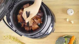 放入电饭锅,按下煮饭键,每隔5分钟开锅翻面,然后继续炖煮