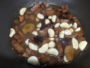 继续煨炖15分钟左右,至汤汁转浓鹌鹑蛋透味,五花肉块香醇软糯时即成。