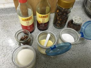 准备调料:老抽,生抽,盐,白糖,鸡精,八角,花椒,辣椒段,白酒或料酒,