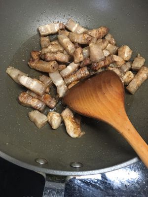 焯好的肉水分控干,炒锅内油六成热下肉煸炒至略金黄