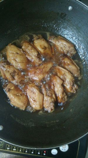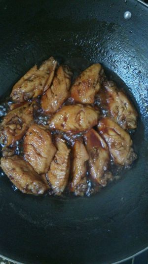 鸡翅熟透后 (可用一根筷子插入测试)调入适量盐 开大点火收干多余汤汁 炒匀鸡翅