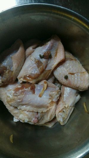 鸡翅洗干净了用刀划两刀。用料酒、生抽(适量)、生姜、花椒籽、十三香(适量)腌制半小时