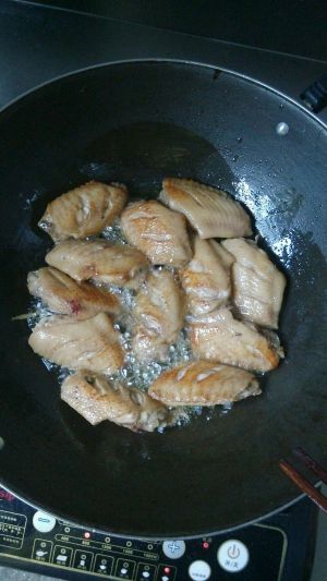 先将鸡翅划几刀,以便更好入味,放入锅中稍稍翻炒下,放入备好得姜蒜,稍放生抽,倒入可乐。可乐多少应个人口味