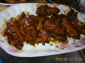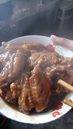 在锅里,加少量油,加热至四成;下冰糖,待融化,成焦糖色;下鸡翅,翻炒上色。