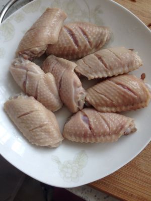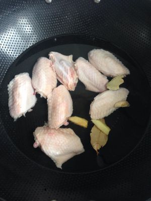 鸡翅洗干净,表面划几刀,放冷水中加少许料酒香叶焯水