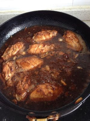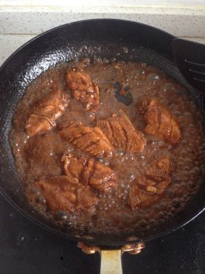 焖到可乐还剩一些的时候,大火翻炒收汁,这时尝尝味道,因为可乐很甜,如果觉得不够咸再加点盐