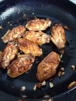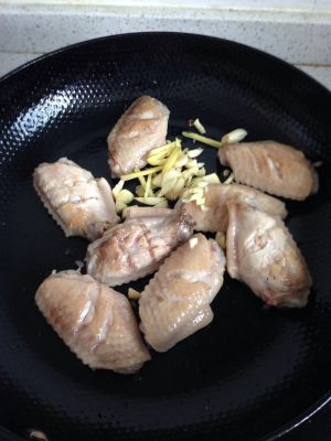 腌好鸡翅后,锅烧热,下少量油,三成热后调小火,下腌好的姜片、蒜瓣,下八角、桂皮,翻炒至出香味,将鸡翅一个个入锅,煎至俩面金黄,并且尽量把鸡翅侧面也煎黄。