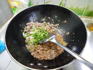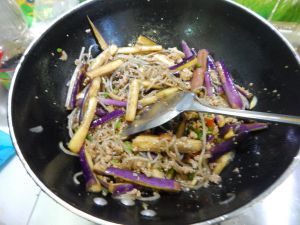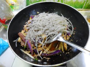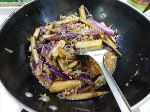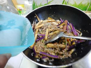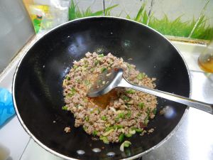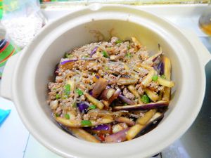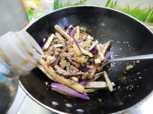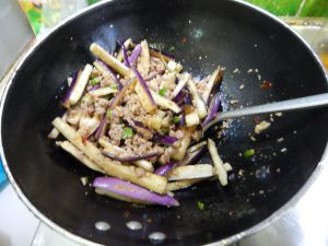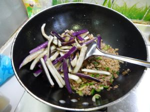 开锅,翻炒几下,茄子看似要熟的时候倒入搅拌好的肉馅再加少许水,放入适量盐 鸡粉 味精 酱油,再翻炒。