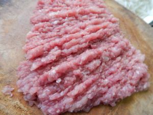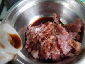 肉馅调味 放入葱末 姜末,少许盐、白胡椒、鸡精,搅拌均匀,费用