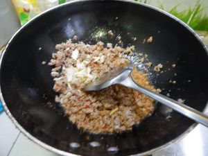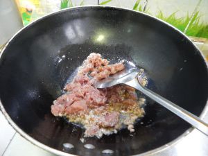 第三步,给锅里倒入少许油,油热后放入蒜,炒几下,然后将肉末倒入锅中,翻炒,滴入老抽继续翻炒