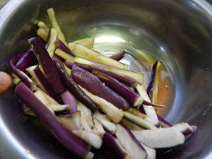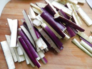 茄子去皮 切条,过油至微变黄 变软,沥油备用
