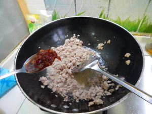 肉末入锅翻炒至香加入豆瓣酱和生抽