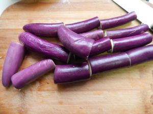 第一步,将茄子洗干净切成等长的小段,将蒜切成小丁