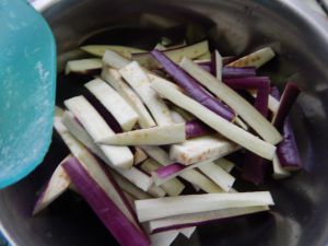 第二步,锅中倒入油,待油热后将茄子条放入锅中,煎至茄子变成黄色的软软的,将它们捞出