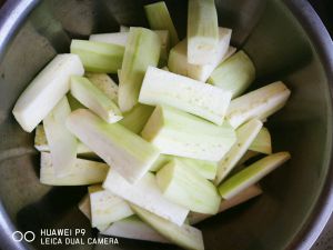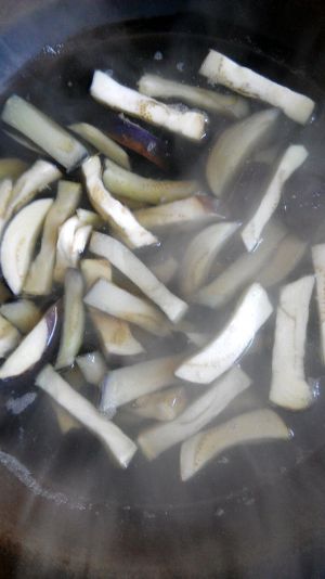茄子洗净,切条,泡水,然后捞起备用