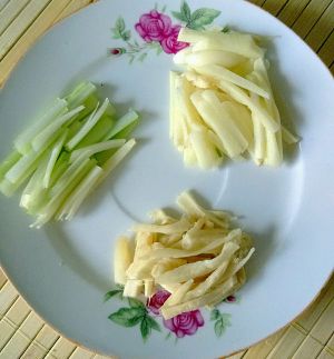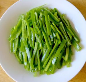 腌肉的时候开始切青椒,青椒切成细丝,切完青椒就可以开始炒了