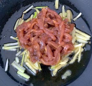 放入肉丝,大火快速炒散(火小,会使肉丝炒老,影响口感)