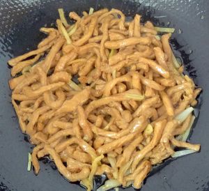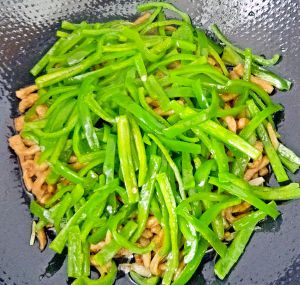 起锅,放少许油,油热后放入青椒丝,煸炒至微微发软,盛出备用。