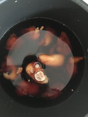 锅中放入料酒 生抽 老抽(我的比例是2:2:1) 生姜 大蒜 冰糖 没有冰糖就放一勺白糖(家里有八角跟香叶的也可以放一些,会香一点)没过猪脚的水 我用电压力煲压的,用炒锅的话就得小火煮一个小时,反正尝一下觉得烂了就行