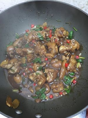 放入猪蹄翻炒,加老抽、陈醋、盐调味,添水没过猪蹄