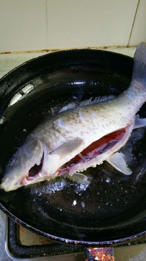 选用不粘平底锅加比平时炒菜多点的油,大概七八成热的时候放入鲫鱼,中大火煎鱼。其间不可用铲子铲来铲去,否则鱼皮就都掉了。煎五分钟左右,轻轻摆动锅子鱼可以轻松滑动就证明煎好了,把鱼翻个面继续煎。