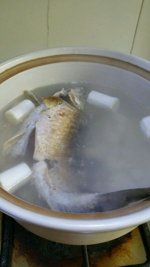 另起砂锅加水,姜片,葱段,豆腐大火烧开。放入煎好的鲫鱼,大火煮沸后转小火。
