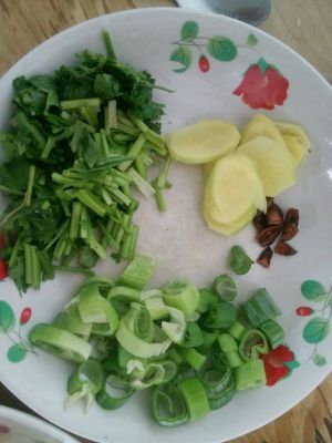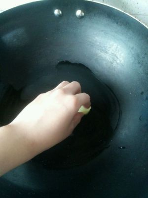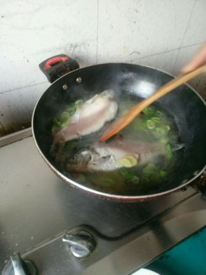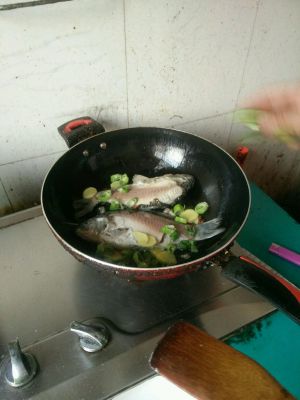 倒油,油热后先把鱼煎一下,然后再放姜,葱,大料,翻几个个煎一下