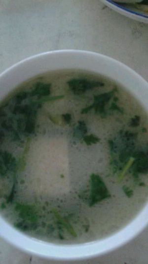 加入温开水,大火烧开,放盐,放入豆腐,小火炖一会,放香菜,煮至奶白色就可以出锅了