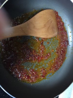 锅中留底油(一点点)放入豆瓣酱~炒匀……