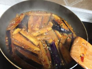 待茄子皮变色,倒入料汁,快速翻炒