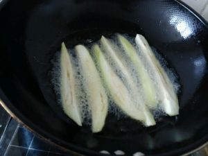 热锅倒入食用油,油温八成热时,放入切好的茄子,茄子炸软了捞起来。