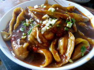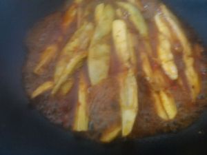 3.将油烧热,把茄子放进去炸2-3分钟捞出,再用小火把油烧热,将葱姜蒜爆炒香加入豆瓣,再将茄子倒入翻炒3-4分钟,加入盐,醋,糖(有冰糖最好,可以提色),最后勾芡起锅!!