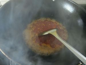 锅内留底油,复置火上,加入豆瓣酱炒出红油,加入姜末,蒜末炒出香味,加水(不可太多)白糖,醋,酱油,耗油待水烧开